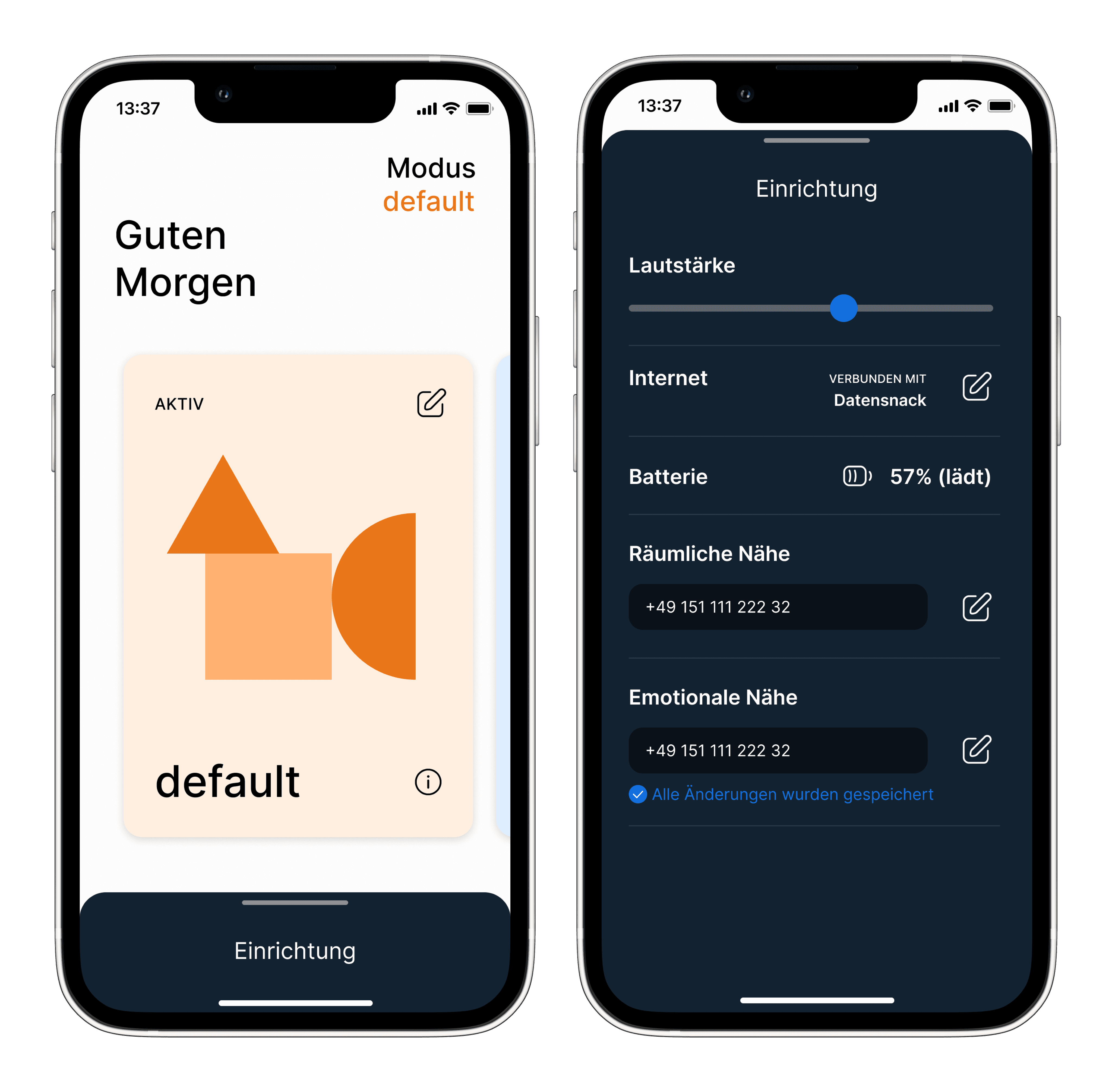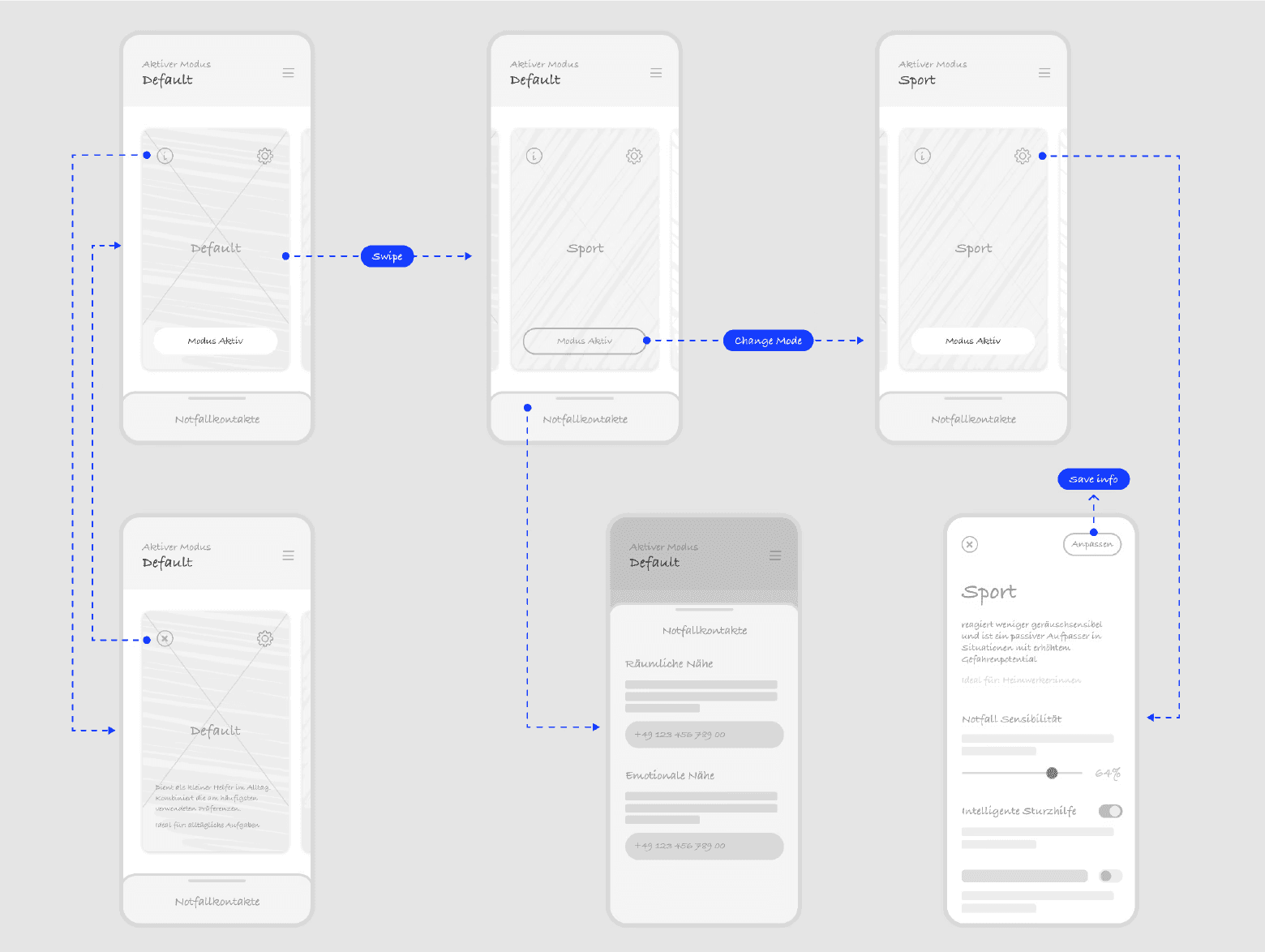 The companion app is used to set up the product, allowing users to save emergency contacts, select their preferred user mode, and fine-tune sensor sensitivity. After user testing a few lo-fi mockups, a first prototype was developed for the final presentation.
