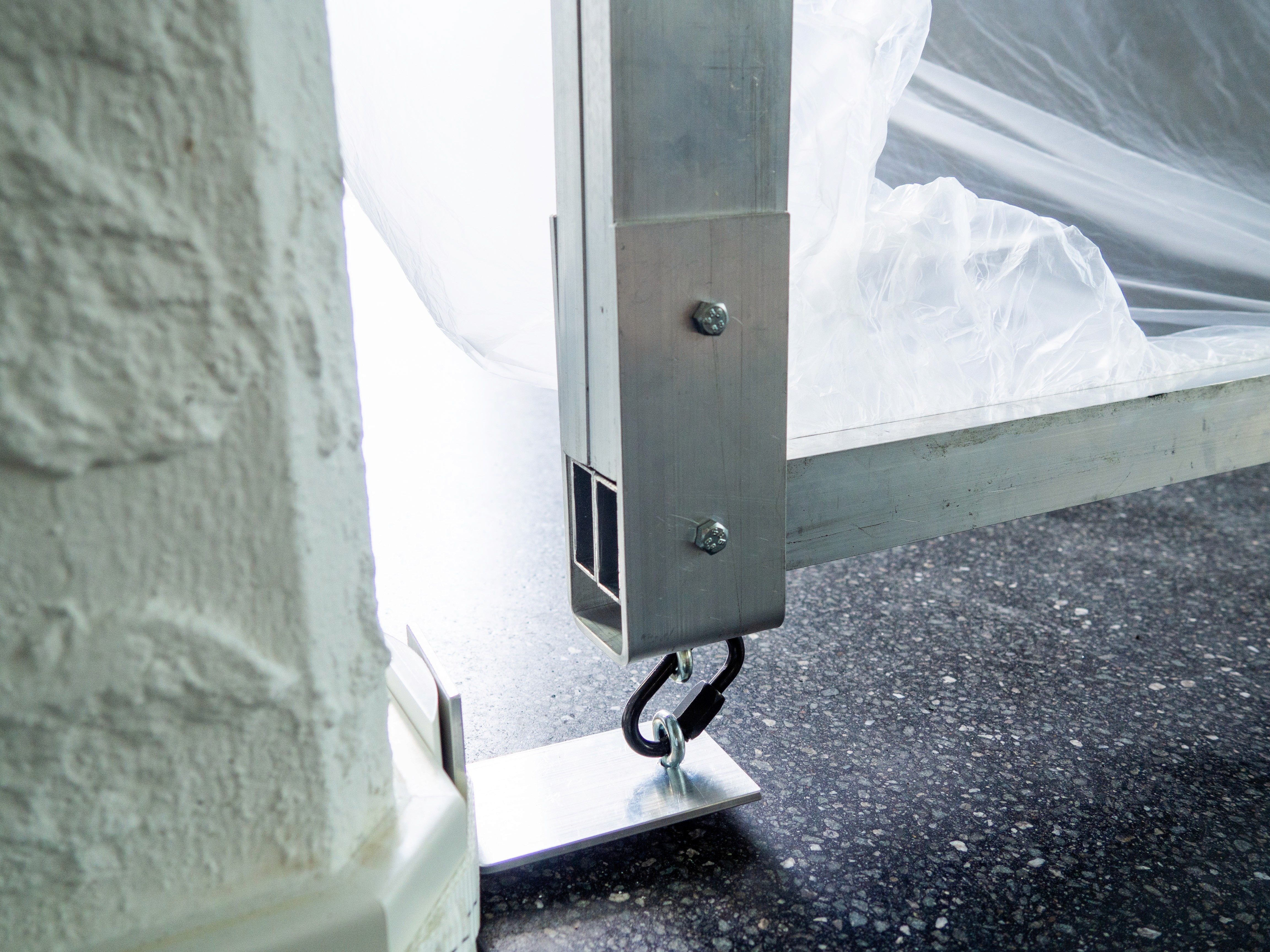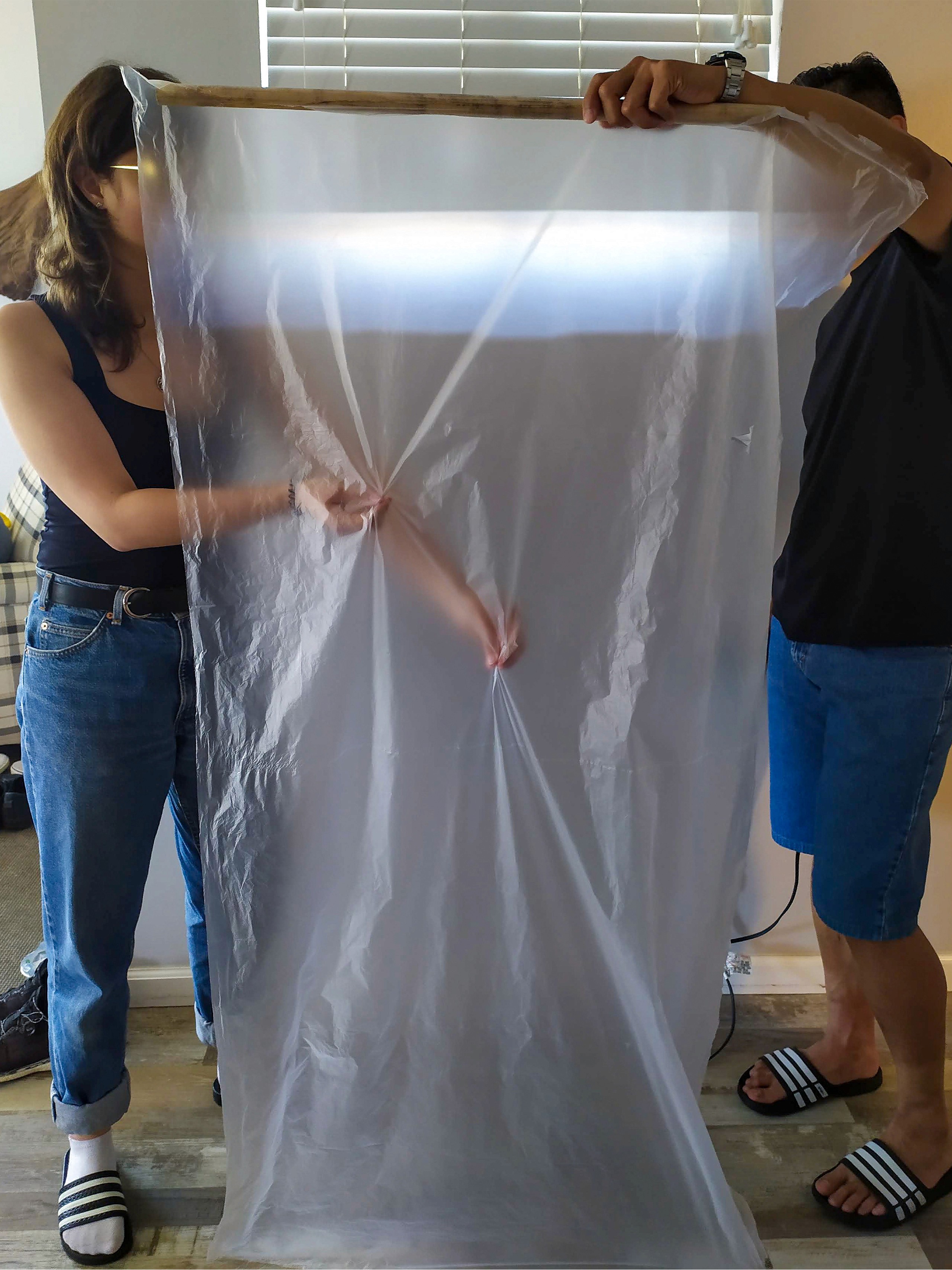 Thin, semi-transparent foil is an unassuming material with interesting properties. It is easily disturbed by only the smallest gust of wind and moves mystically as if in slow motion. It also creates a captivating blurred effect depending on how near or far things are from it. The final model was constructed from aluminum poles which were connected by wing screws for easy assembly.