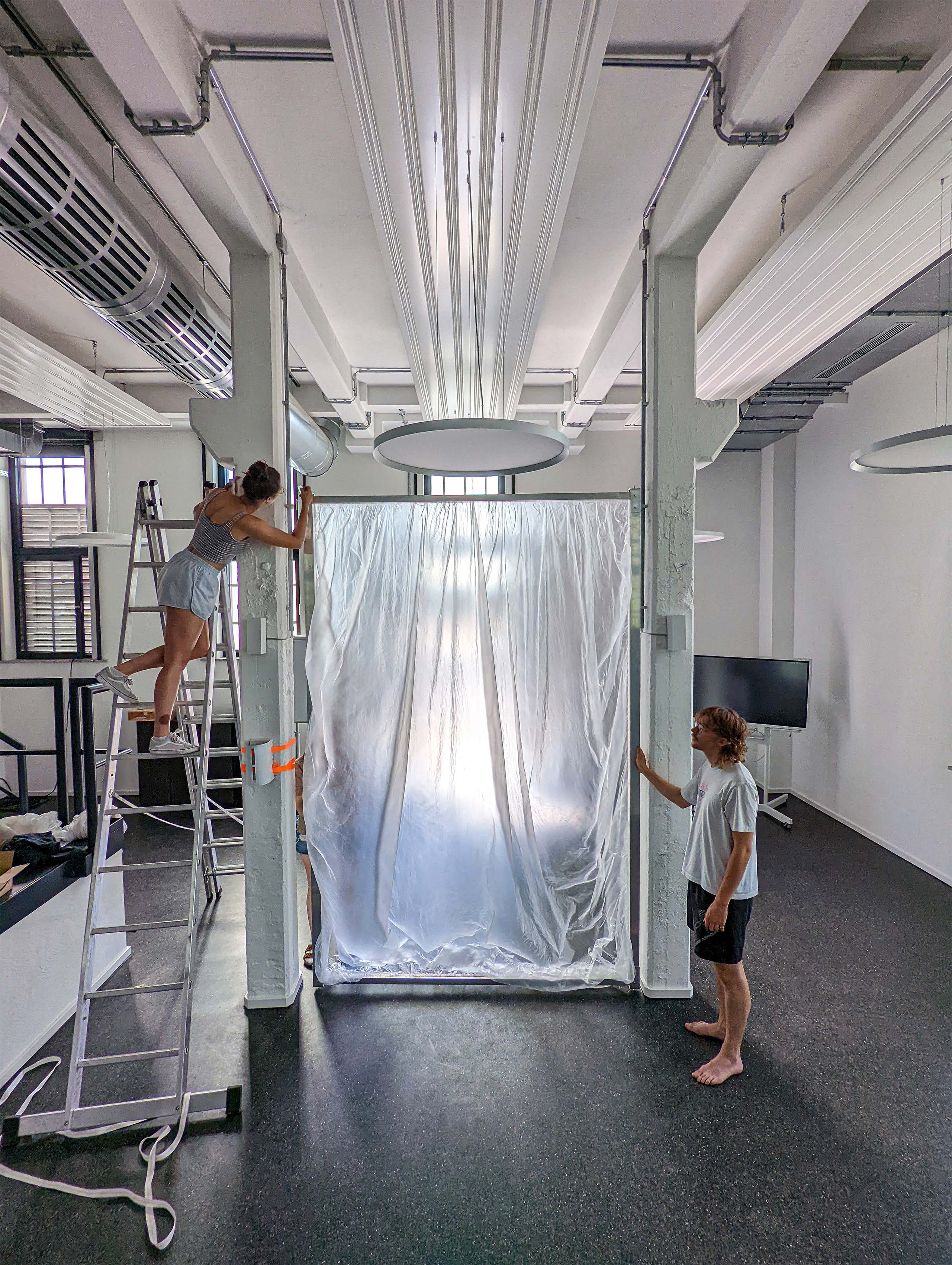 Thin, semi-transparent foil is an unassuming material with interesting properties. It is easily disturbed by only the smallest gust of wind and moves mystically as if in slow motion. It also creates a captivating blurred effect depending on how near or far things are from it. The final model was constructed from aluminum poles which were connected by hexagon bolts for easy assembly.